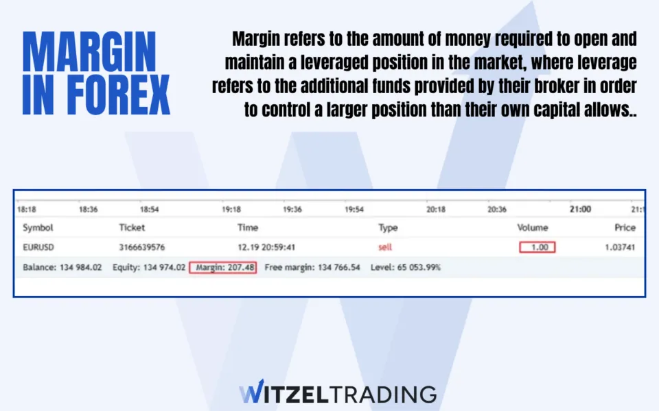 In forex trading, margin refers to the amount of money required by a trader to open and maintain a leveraged position in the market, where leverage refers to the additional funds provided by their broker (as a loan) in order to control a larger position than their own capital allows.