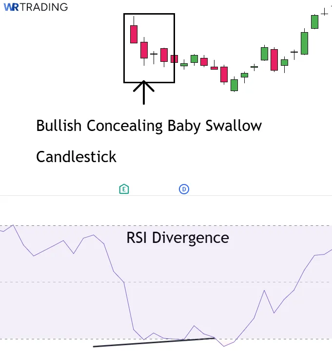 Relative Strength Index (RSI) is a powerful momentum filter that helps confirm when the market is overstretched and ready to reverse. In a bullish Concealing Baby Swallow setup, the RSI should show higher lows while the price makes lower lows. This divergence indicates that momentum is weakening even though the price continues to push downward.